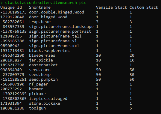 Usage Example: stacksizecontroller.setstack generator.wind.scrap 5 (Hard limit) or stacksizecontroller.setstack wood 20x (Multiplier)