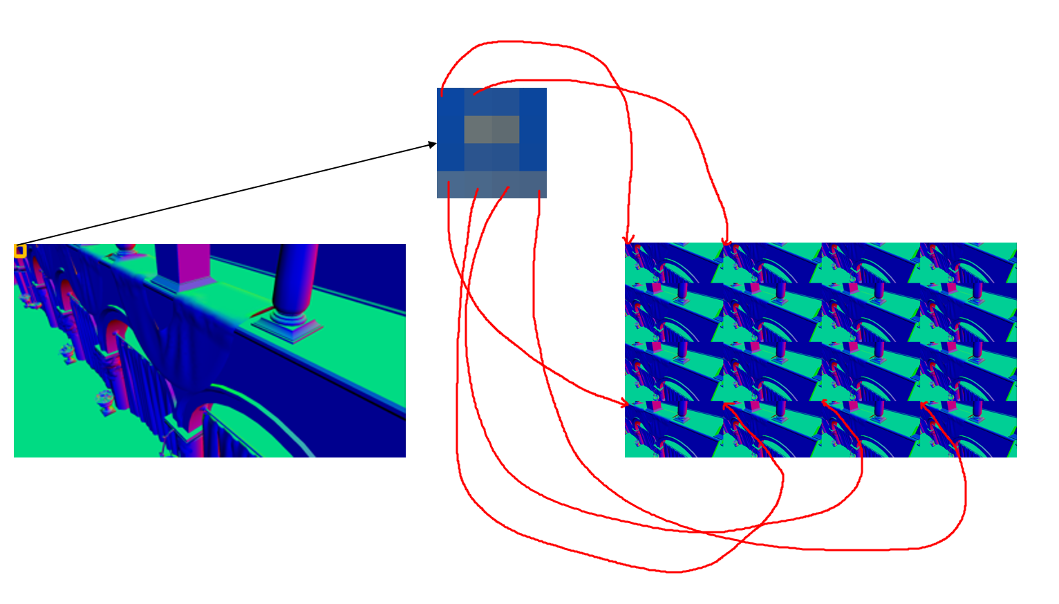 分块本质如上图所示,他的意思就是我们从头到尾的按照44像素的进行遍历,对于每一块44像素里面的每个像素,依次利用一个公式讲他们按顺序放入上图右边的块中。如上图所示,对于第一个4*4的小块,将第一个像素,放入第一块,第二个像素放入第二块....第16个像素放入第16块。直接遍历到图片末尾,就可以将图片中的像素全部均匀的分配到16个小块中了,也就组成了16个小场景,这16个小场景本身是完全不同的,他是把大场景中的像素进行了一个重新组合而已,还是以前的像素。并不是16个完全相同的场景。分块公式如下: