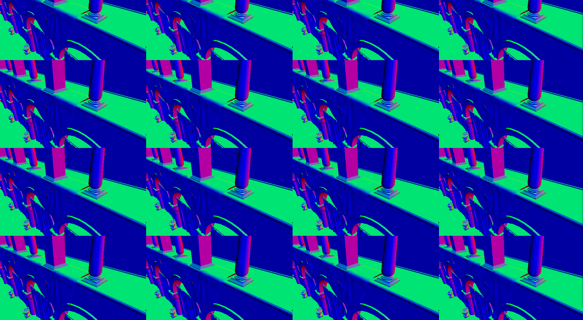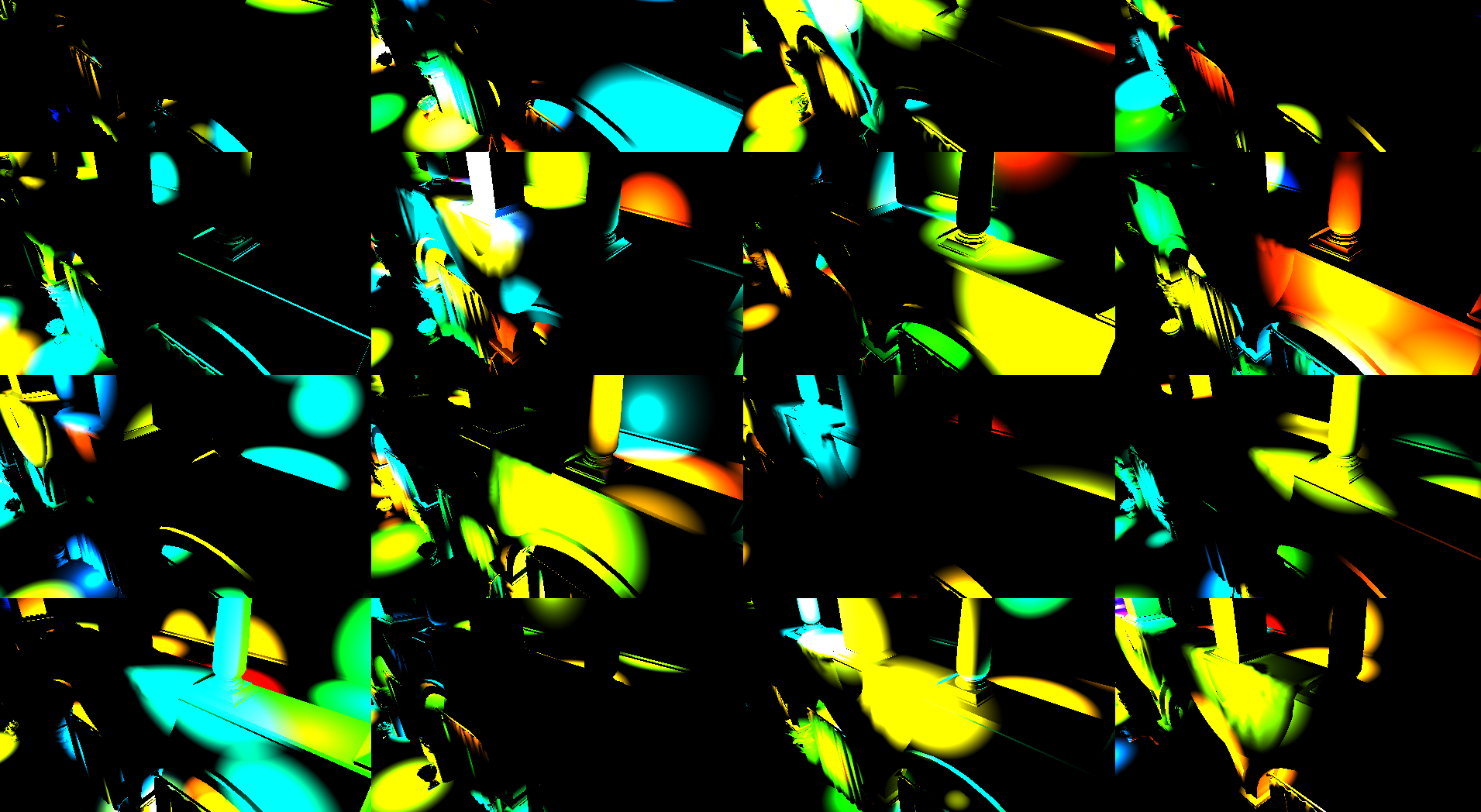 计算光照就和普通计算一样,不过需要的是将所有的VPL均匀的分给每一块即可(可以通过自己当前处理的像素位置来计算当前是第几块场景,然后计算VPL的起点和终点即可)。但最最重要的一点是,需要将最后计算的结果乘以你分块的数量。大家可以这样想上面的分块的时候对于4*4像素要按顺序分到16块中,对于一个光源而言,原本这16个像素都要进行对这个光源的光照计算的,但是由于分块了,那么这个光源只会在一块中进行光照计算,那么剩下15个像素就不能计算这个光照了,所以亮度就暗了16倍,因此要乘以块数才行。有人可能会问,那么这个结果不就不准确了吗。是的这样处理之后结果会非常不准确,因此这个方法我们多用于间接光照(间接光照对场景的光照贡献不高,就算是不准确也很难发现)。光源开始结束索引如下: