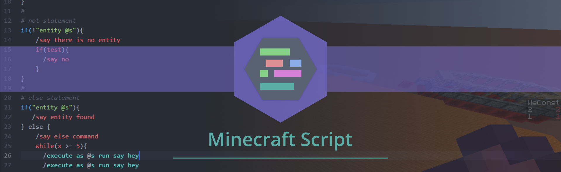 Minecraft Script is a programming language for developers of mcfunctions, Minecraft maps and packages. The .mcscript files are therefore compiled and generated to the function format. This enables the developer extended possibilities, such as Modals, Loops, Varibles, Constants and Command-Wrapping.