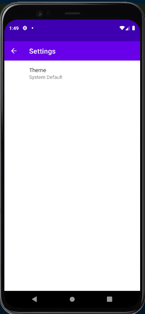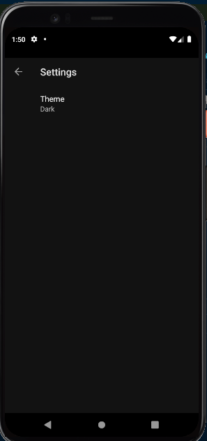 DarkTheme This project shows how to implement Android Material design Dark theme. Download apk file here System Light Theme Dark Theme Light Theme System Dark Theme