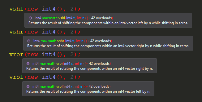 byte32,short16,int8, andfloat8. This allows you to leverage the full potential of SIMD computation. - Many Additional Functions: MaxMath includes a massive library of mathematical functions not found in Unity.Mathematics, with about five times as many highly optimized functions at your disposal. Each function is fully documented with XML annotations. A full list is provided further below.