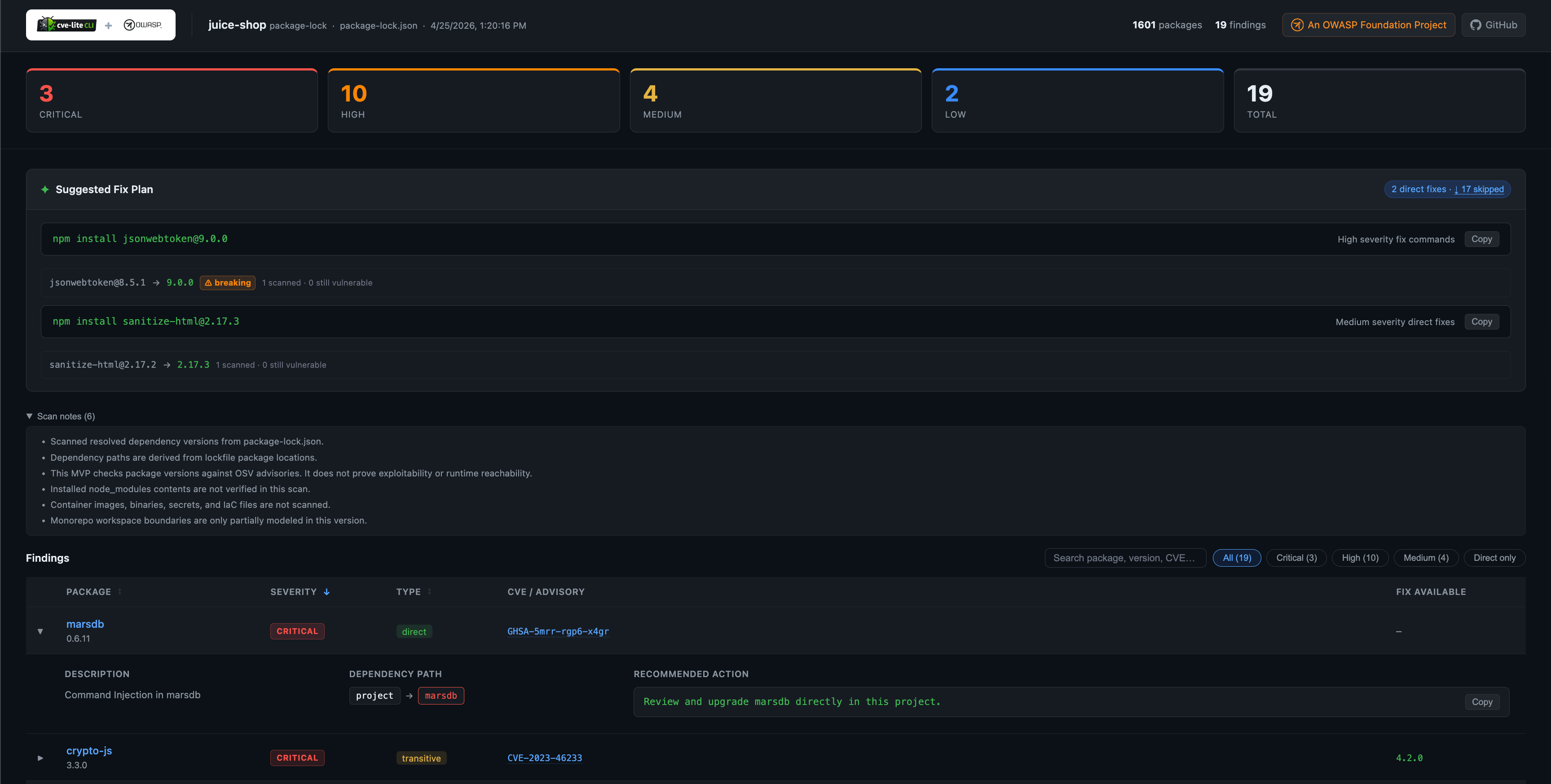 • OWASP Juice Shop — scanning a deliberately vulnerable application with known dependency issues