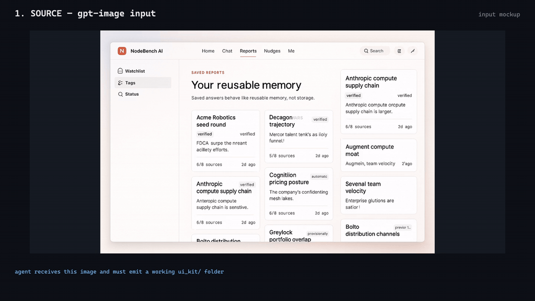BENCHMARKS.mdat repo root has the full methodology + run-by-run real-data results across model tiers (Opus, Pro+Pro+iterate, Kimi+Gemini3, NodeBench iter), reproducibility instructions, honest non-claims, and research citations (WebDevJudge, Prometheus-Vision, Trust-but-Verify ICCV 2025).Note the iter-0 → iter-1 regression on the same source: agent fixed some gaps but introduced new layout drift. The boolean rubric exposes this honestly rather than fudging the score upward. This is the intended behavior, not a bug.
