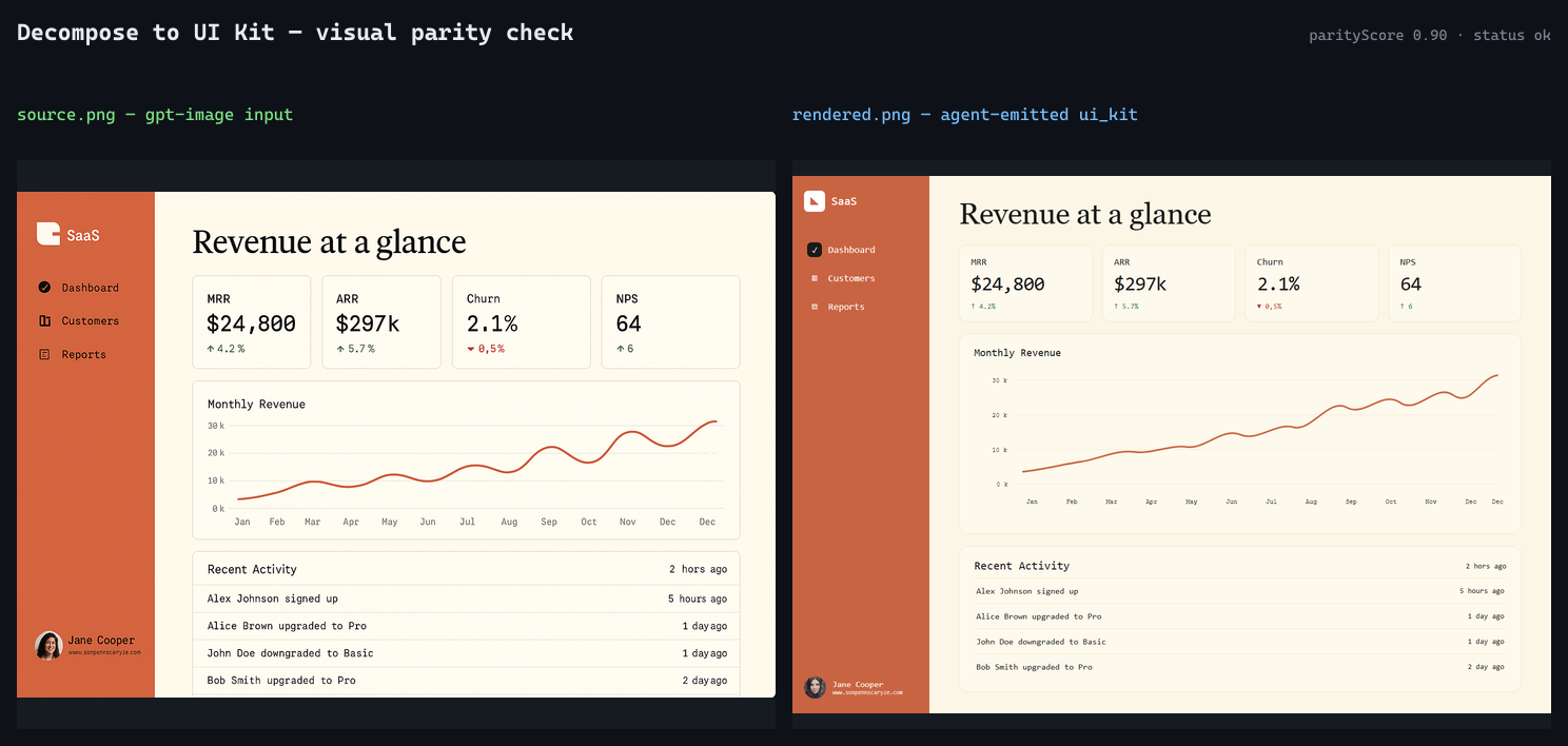 Side-by-side hero — source vs agent-emitted ui_kit (