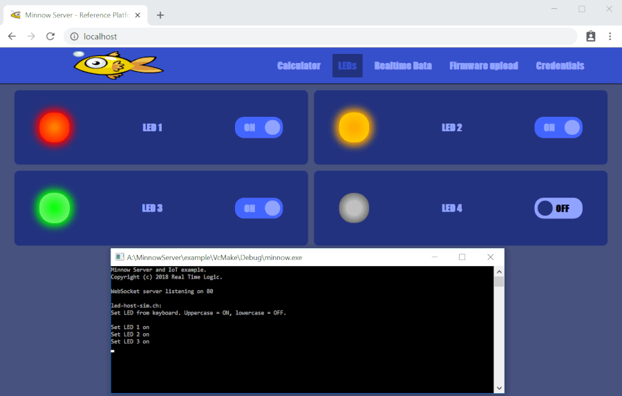 The Minnow Server Reference Example is a fully functional example that follows the design guidelines outlined in the tutorial Creating Single-Page Apps with the Minnow Server. Figure 1 shows the HTML5 LED web page provided by this example. The example is designed such that one can use it as a base for developing a professional web-based device management application.
