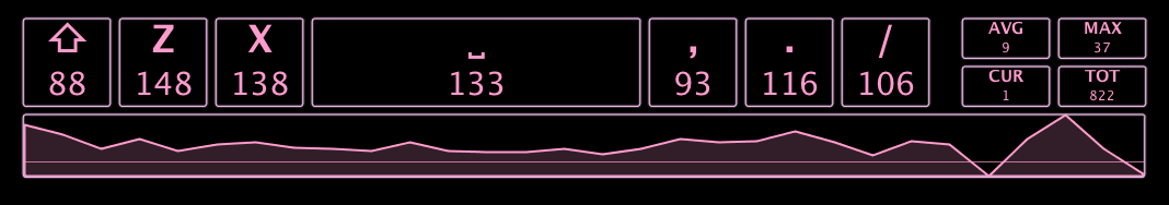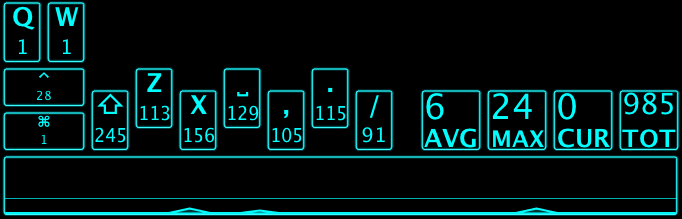 For each configured key the program will show how many times it was pressed. By default it will also show the maximum, average and current number of keys pressed per second. When enabled it can also show a graph of the number of keys pressed per second over time, the total number of keys pressed, and the time since the last input. A graph showing cursor movement is also available and more graph types and panel types are planned.