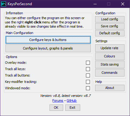 KeysPerSecond is a program that counts how many times certain keys and mouse buttons are pressed. It can also show various statistics such as the average, maximum and current number of pressed per second. The program can also show a graph of the key presses over time. Almost all aspects of the program are also fully customisable.