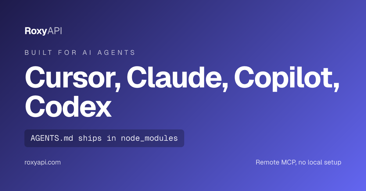 Agents supporting AGENTS.md (Claude Code, Cursor, GitHub Copilot, OpenAI Codex, Gemini CLI) will pick it up automatically. For other tools, point your agent to node_modules/@roxyapi/sdk/AGENTS.md.