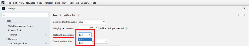 Go to File > Settings > Tools > UnitTestBot and choose the approach to overflows: whether UnitTestBot should Ignore overflows or Treat overflows as errors.
