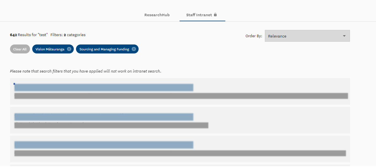 A tabbed interface has been added to the search results page using Angular Material Tabs component. ResearchHub results are shown in the default tab, and Staff Intranet results are shown (if the user is logged in) in a second tab, as a separate list. Results are only returned when a search query is present. Search filters are not applied on the Intranet results.