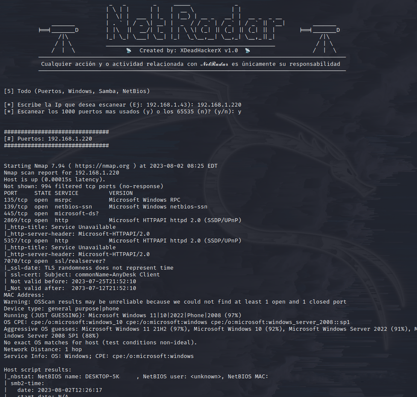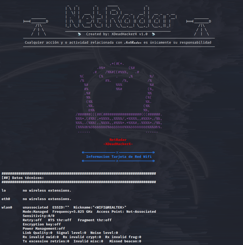 Buenas, soy XDeadHackerX y quiero presentaros mi nueva herramienta llamada NetRadar. Esta Tool está enfocada al Networking en concreto al Mapeo de Redes Locales y Redes Wifi. A Nivel de Red Local, es capaz de analizar todos los Dispositivos conectados (MAC, Vendedor MAC, Sistema Operativo, Nombre, Tipo de Dispositivo), todos los Puertos abiertos de cada IP (Puerto, Servicio, Versión del Servicio, Estado, Banner), encontrar Servidores (Nombre, Sistema Operativo, Versión del Servicio, Dominio, Puertos, etc.) A Nivel de Red Wifi nos encontramos con 4 tipos de escaneos totalmente automatizados y muy potentes (Aircrack-ng, Bettercap, NmCli y Wash), al terminar el escaneo nos generará un Gráfico *en el que te muestra un esquema de las Redes Wifi detectadas (MAC, Distancia desde nuestra Tarjeta de Red Wifi, Beacons, Canal, Velocidad del Router, Encriptación, AUTH y el Nombre de la Red Wifi) y los Dispositivos conectados a cada Red, mostrándote (Mac, Fabricante de la Mac, Tipo de dispositivo y tiempo conectados a la Red).