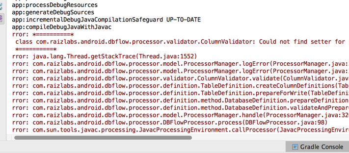 Check to see if you are using private fields. If so, you need to define manually the getter and setters for these fields. Otherwise you may notice `class com.raizlabs.android.dbflow.processor.validator.ColumnValidator: Could not find setter for private element: "fieldName" from table class: MyTableName```