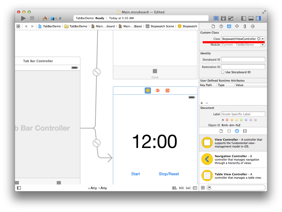 We set the Custom Class property of one of the view controllers in our