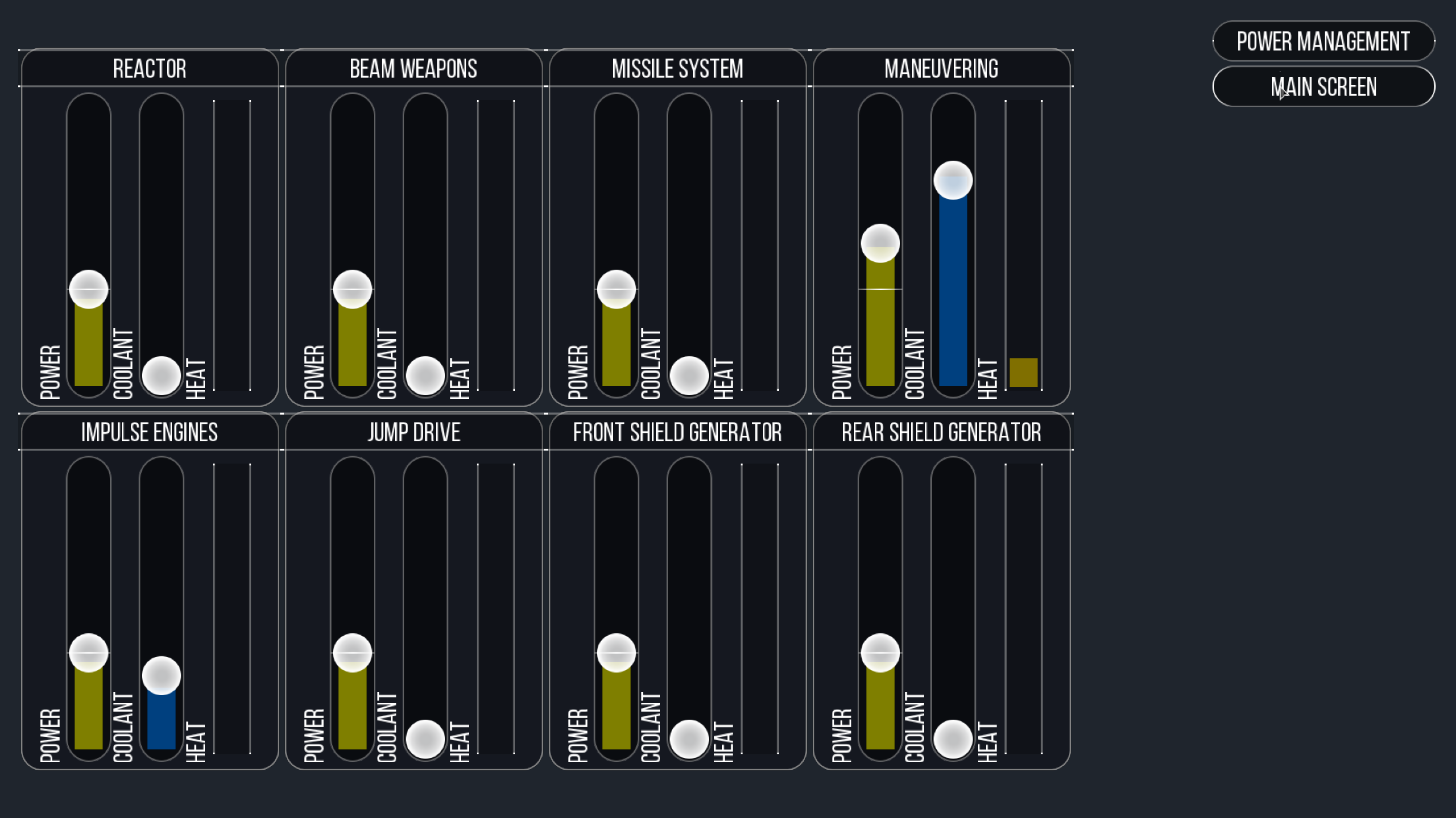 Power Management: The Engineering officer can route power to systems by selecting a system and moving its power slider. Giving a system more power increases its output. For instance, an overpowered reactor produces more energy, overpowered shields reduce more damage and regenerate faster, and overpowered impulse engines increase its maximum speed. Overpowering a system (above 100%) also increases its heat generation and, except for the reactor, its energy draw. Underpowering a system (below 100%) likewise reduces heat output and energy draw.