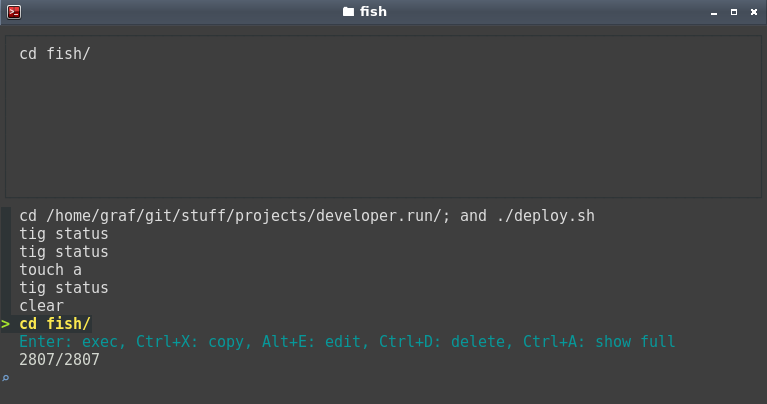 ls,ll, andcdhistory.Ctrl+Eis better way to access previosly visited directories fish_user_key_bindings"Key bindings. Go to functions definition for description. Usefish_key_reader. Docs"fish_title"Prints directory and currently running command in tab title.user@hostin prompt when connected via ssh."fish_greeting"Prints/var/run/motd.dynamicas greeting. Use in combination with headlines.sh to see top news"show_exit_code"Show exit code on command failure" --on-event fish_postexecwhat-did-just-happened"Show start time, and duration of last executed command"save_dir"If command was executed if directory, save dir to Ctrl+E history for quick access." --on-event fish_postexecfzf-history-widget"Ctrl+R for history"search"CTRL+FFuzzy recursive search files by name in current directory & append selection to current command"search-contents"ALT+CTRL+Fsearch (fuzzy) file by contents"scd"Ctrl+Eto access most frequently visited directories."update-fzf"Installs or updates fzf"freq"Line frequency in piped input. See https://gist.github.com/rsvp/1859875"bind_bang"Type!!to get last command"bind_dollar"Type!\$to get last command argument"