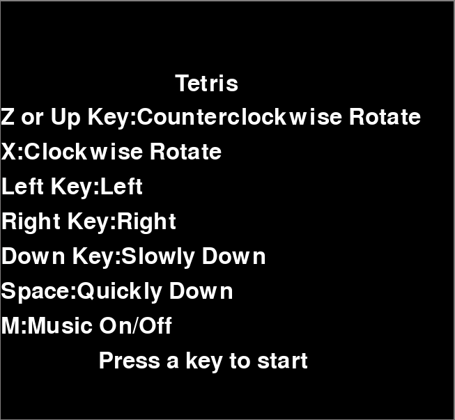 Tetris with pygame,the module of python Pre-installation python3 and pygame Start python3 Tetris.py How to play Instruction Right,Left and Down arrow key to move z,x or Up arrow key to rotate space to immediately down to the bottom Select difficulty Difficulty from 0 to 5 Game preview