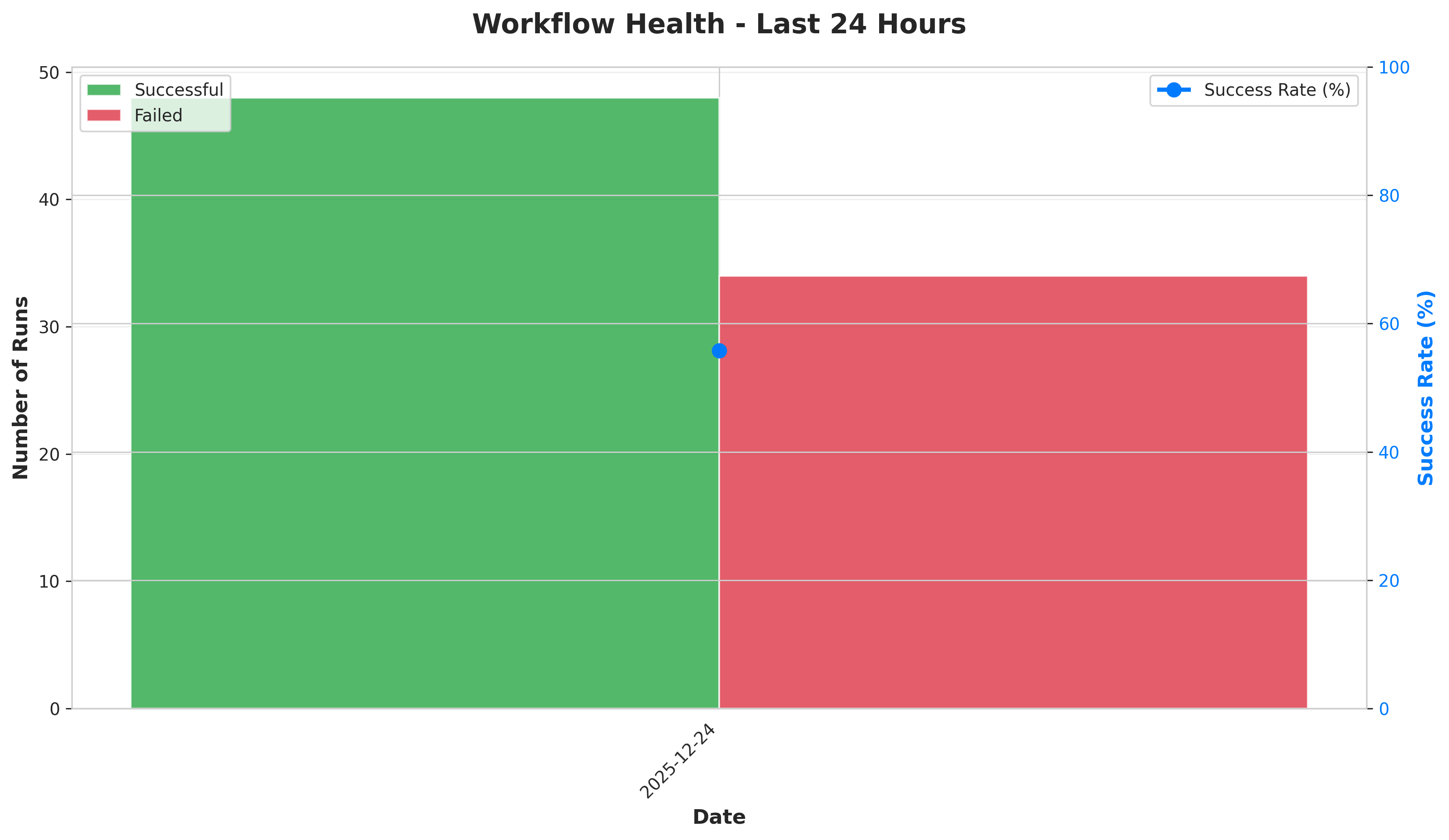 Analysis: Success rate of 55.8% indicates significant stability concerns with 38 failed runs out of 86 total. This is a decline from the previous audit (December 22) which showed 76.92% success rate, suggesting increased workflow fragility.