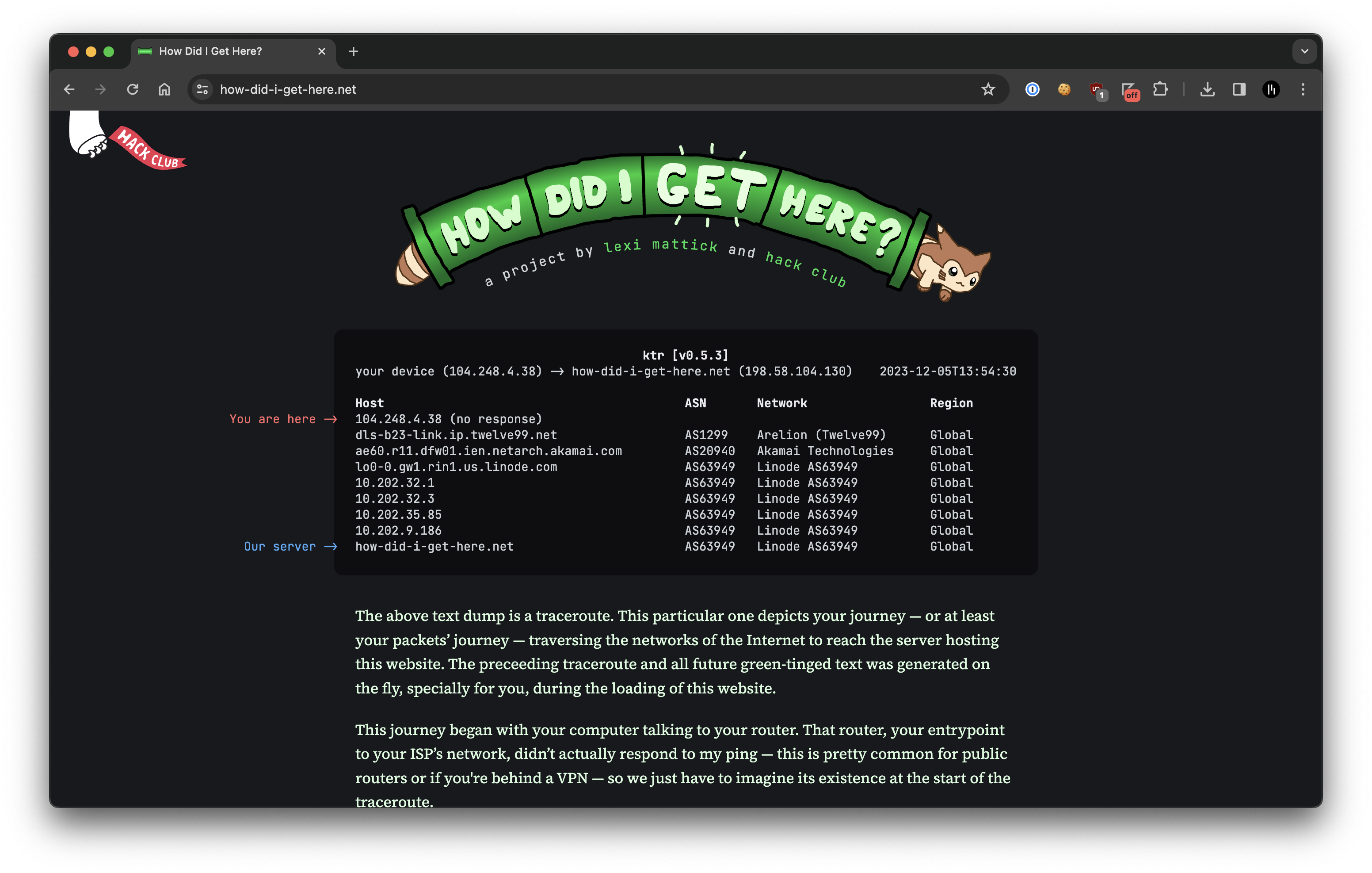 On load, it runs a traceroute to your public IP, loading ASN and PeeringDB information, and live HTTP streams the results. Then, 500 lines of if statements render a generative article describing the path of network provenance your traceroute covered. Finally, I include a bonus article about how the traceroute program works and what BGP is.