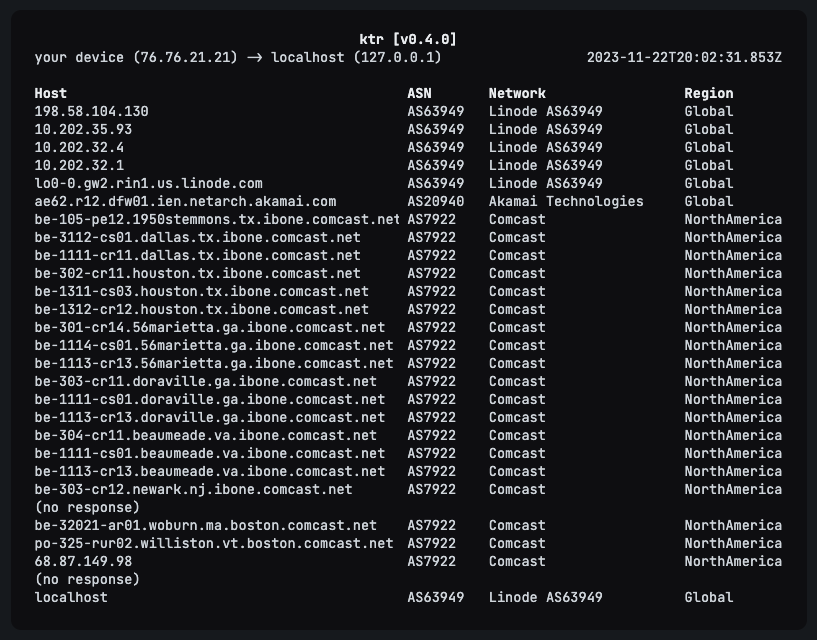 ktr_lib: main library code, handles traceroute, WHOIS lookups of ASNs, and PeeringDB SQLite supportktr_agent: daemon executable that allows use of the library over STDIN/STDOUT