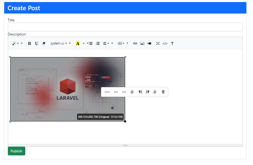 This repository demonstrates how to implement a CRUD (Create, Read, Update, Delete) system in Laravel 12 with the Summernote WYSIWYG editor that supports image uploads inside the editor. The tutorial explains step-by-step how to create posts with a title and rich-text description, upload and manage images, edit posts, and delete them properly.