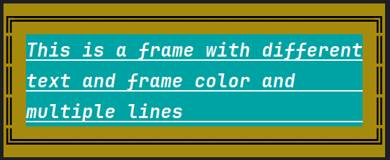 frame("""This is a frame with different text and frame color and multiple lines""", f_s='double', f_c='black', f_b='olive', c='white', b='cyan', s='b-u-it')