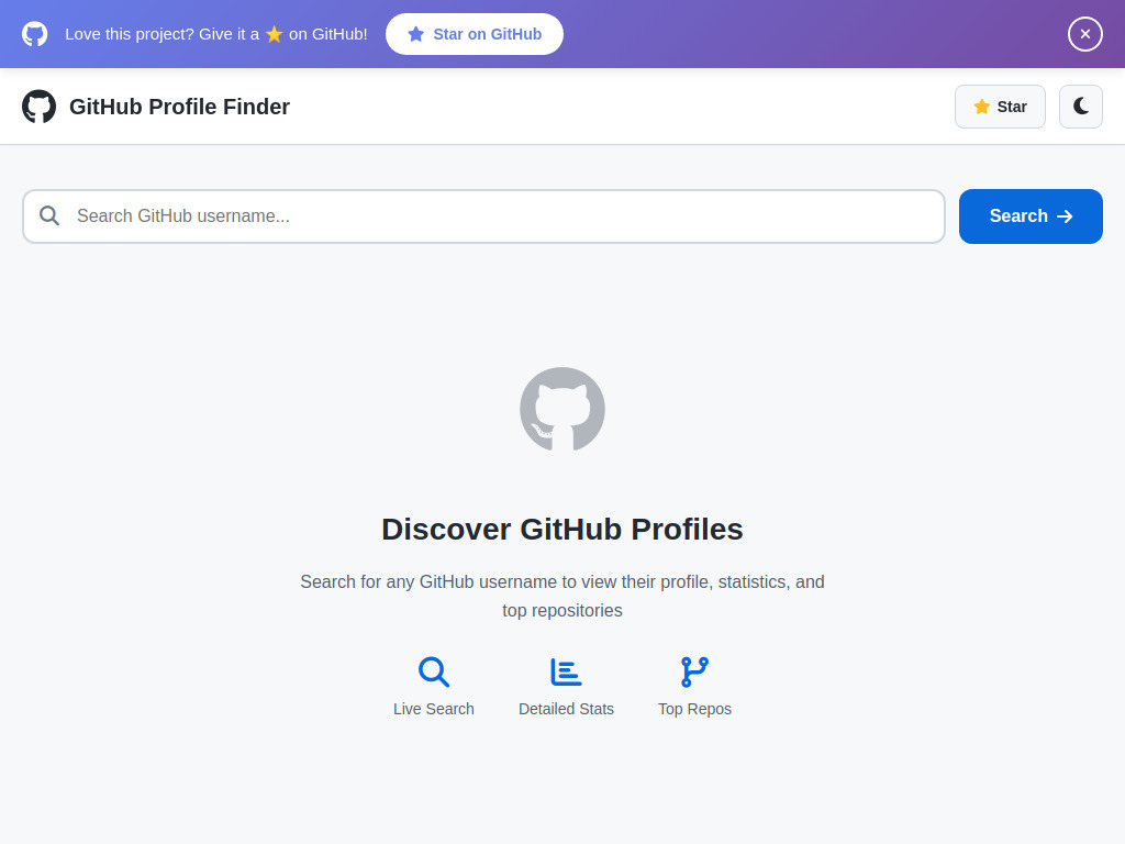 https://yourusername.github.io/github-profile-finder/ - It may take a few minutes for the first deployment
