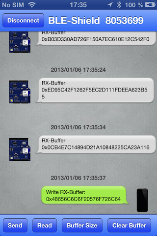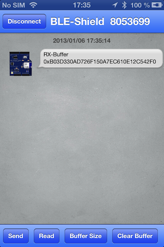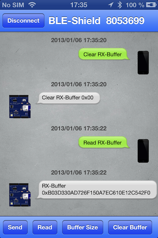 The iPhone App was part of the BLE-Shield Kickstarter campaign https://www.kickstarter.com/projects/rowdyrobot/arduino-ble-shield-connecting-the-ios-and-the-ardu and only supports the BLE-Shield v1.0.0 The BLE-Shield app provides access to the BLE-Shield Service and their characteristics. It's user interface is implemented like a chat application. The chart partners are the BLE-Shield and the iPhone, illustrated by small icons.