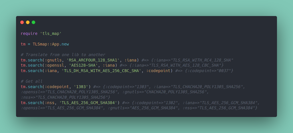 CLI & library for mapping TLS cipher algorithm names: IANA, OpenSSL, GnuTLS, NSS; get information and vulnerabilities about cipher suites; extract cipher suites from external tools: SSLyze, sslscan2, testssl.sh, ssllabs-scan, tlsx