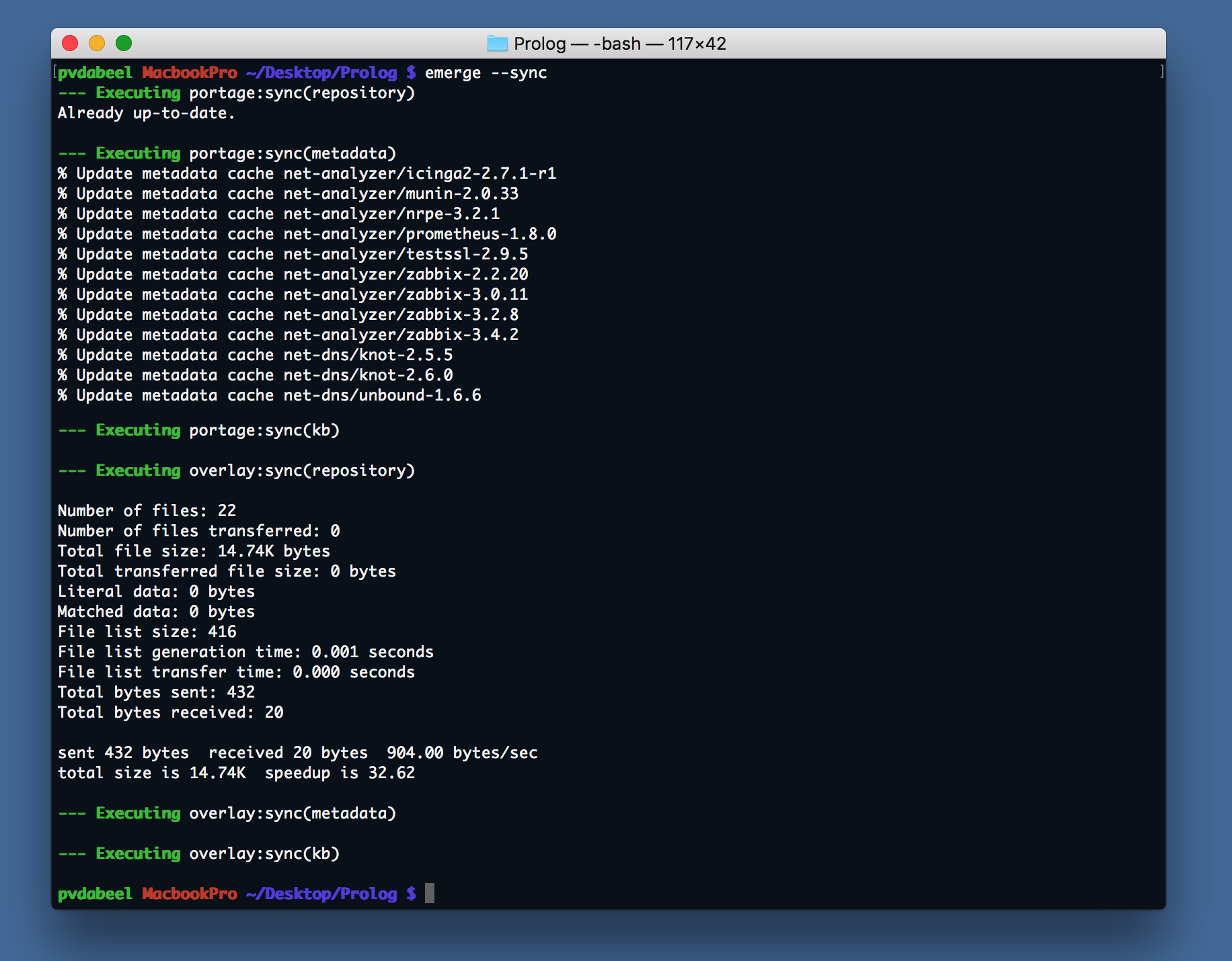 The following screenshot shows a Gentoo Portage repository and a Gentoo overlay being synced using git. Only the changed ebuilds have their Logic metadata updated.