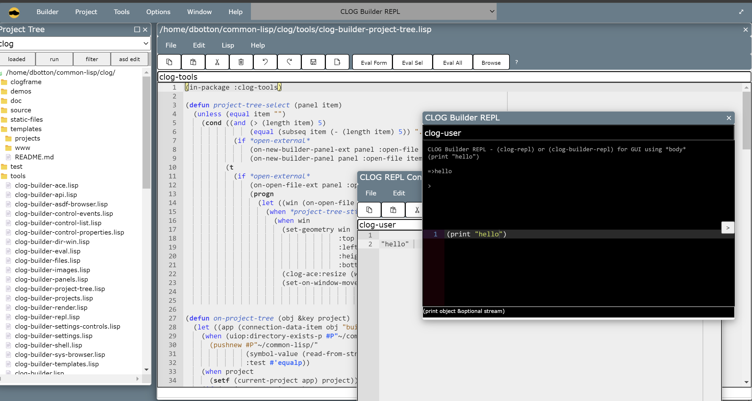 - In a REPL in the builder Tools -> CLOG Builder REPL (can also do all in the slime/sly REPL in emacs)