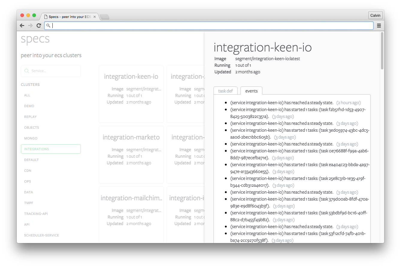 Specs is a high level dashboard for viewing your ECS clusters. For a more complete description, see the blog post.