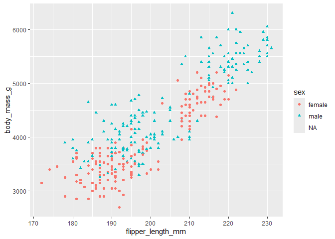 aes(x = flipper_length_mm, y = body_mass_g, colour = sex, shape = sex),