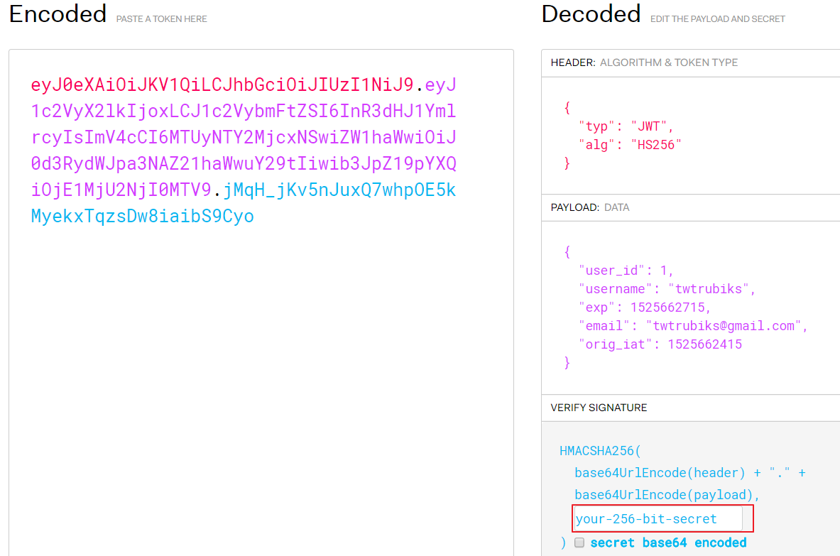 HMACSHA256(base64UrlEncode(header) + "." +base64UrlEncode(payload),secret)