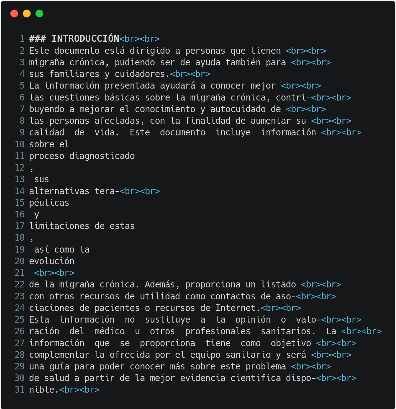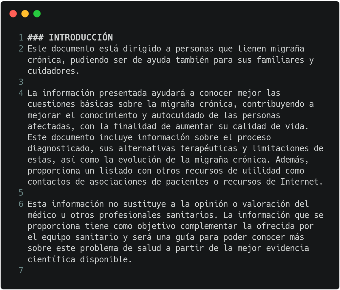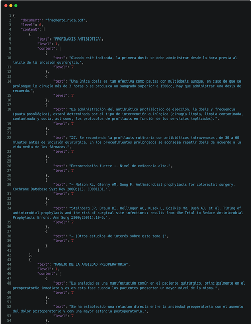 It is possible to obtain an output in JSON structured format, from a conversion from MarkDown, where the level of relevance of the text is indicated (1 is the most important, 7 is the standard text).