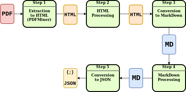 The original document is processed by a pipeline composed by multiple processing steps until reaching the final output format: JSON. It's also possible to get the output file in MarkDown format.